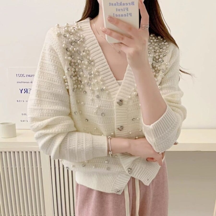 ハートボタン パール ニット Vネック カーディガン ★1054★