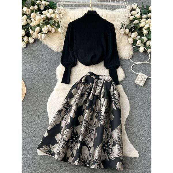 ハイネック ニット&フラワープリント スカート セットアップ ★1097★