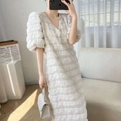 ワッフル パフスリーブ 半袖 マキシ ワンピース ★1315★