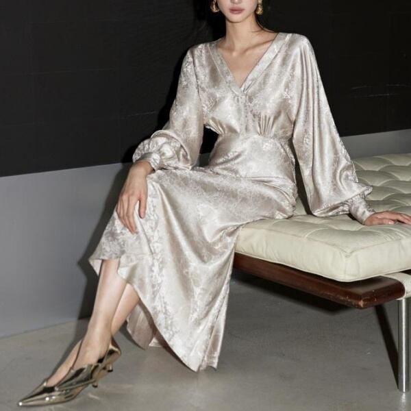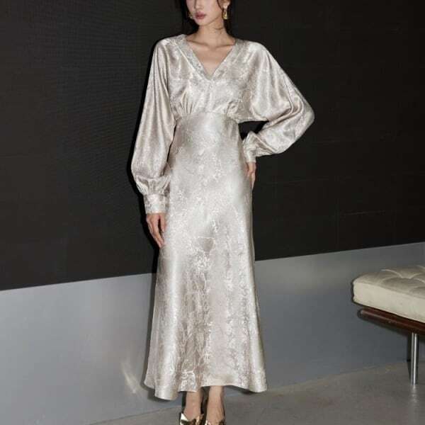 Vネック パフスリーブ とろみ ロング ワンピース ★1461★
